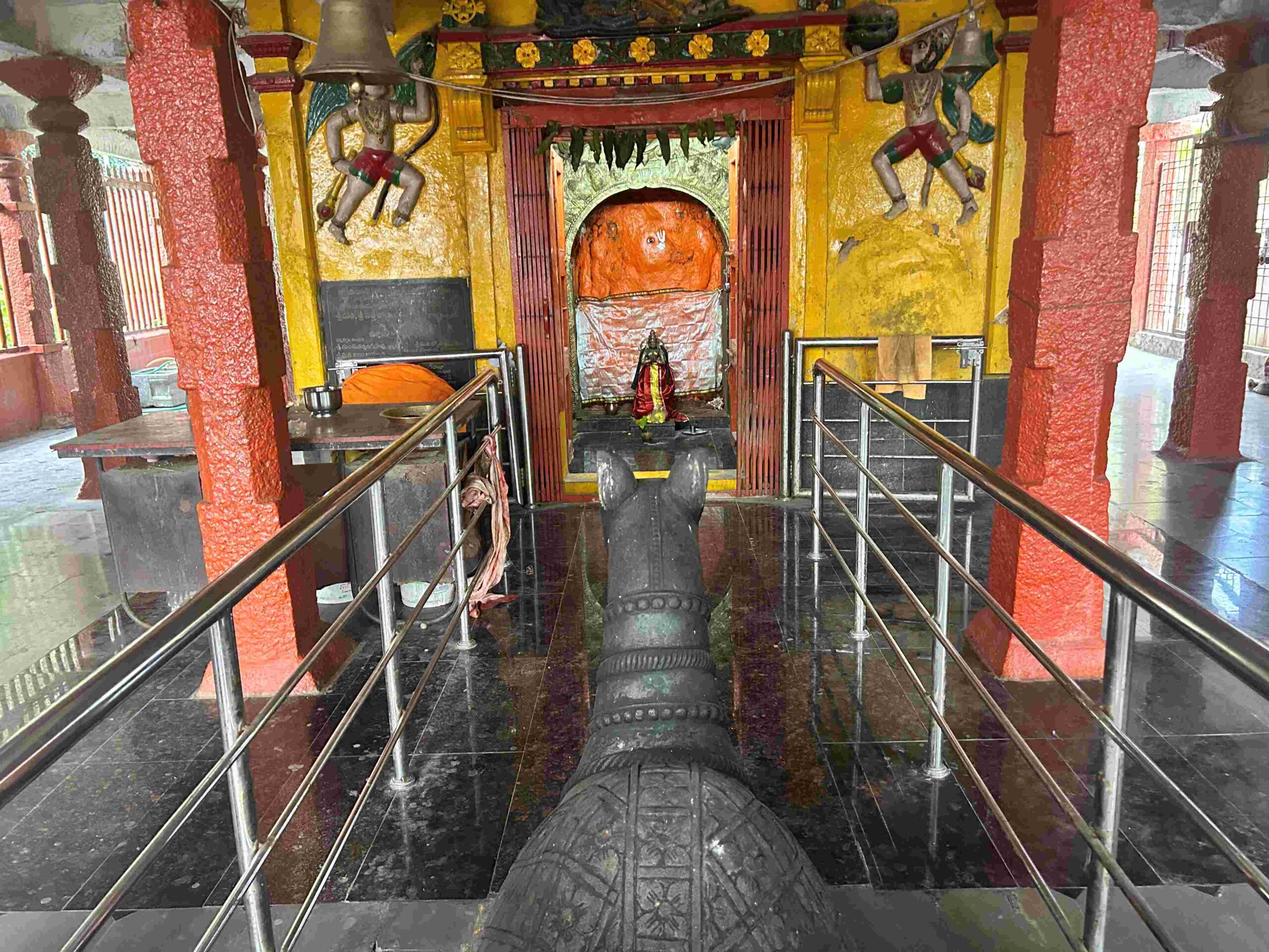 - Temple History This temple is very old Hanuman temple in Secunderabad. This temple is close to 400+ year old temple. There are many specialties in this temple. Both Hanuma, Ganesh are swayambhu here. We can see big camel (hanuma vahanam) at this temple. Trunk of Lord Vinayaka can be seen on right hand side here (usually it will be towards left side). There is a big bell infront of the temple. Other specality is big dwajastambham infront of the temple. There is big Hanuman statue in front of the temple. This temple is on small hill and there are steps to reach this temple. ఈ ఆలయం సికింద్రాబాద్లోని చాలా పురాతనమైన హనుమాన్ దేవాలయం. ఈ ఆలయం 400+ సంవత్సరాల పురాతన ఆలయానికి సమీపంలో ఉంది. ఈ ఆలయంలో ఎన్నో ప్రత్యేకతలు ఉన్నాయి. హనుమ, గణేష్ ఇద్దరూ ఇక్కడ స్వయంభులు. ఈ ఆలయంలో మనం పెద్ద ఒంటె (హనుమ వాహనం) చూడవచ్చు. వినాయకుని ట్రంక్ ఇక్కడ కుడి వైపున చూడవచ్చు (సాధారణంగా ఇది ఎడమ వైపు ఉంటుంది). ఆలయానికి ఎదురుగా పెద్ద గంట ఉంది. ఇతర ప్రత్యేకత ఏమిటంటే ఆలయం ఎదురుగా ఉన్న పెద్ద ద్వజస్తంభం. గుడి ముందు పెద్ద హనుమాన్ విగ్రహం ఉంది. ఈ ఆలయం చిన్న కొండపై ఉంది మరియు ఈ ఆలయానికి చేరుకోవడానికి మెట్లు ఉన్నాయి.
